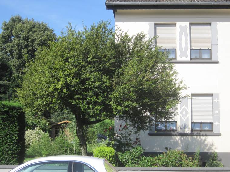 So wie hier in Schaephuysen, steht auf der Tönisbergerstraße, in einem Vorgarten, ein etwa hundert jähriger Buxus sempervirens - Buchsbaum.